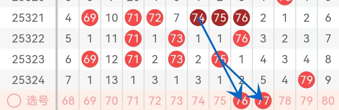 71-80区域:近三期出号数量为:3.3.1,本期重点关注数字:76.77