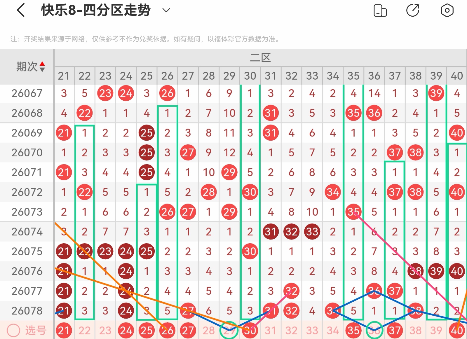 上期开出码,区间平稳,本区防3-5码开出。上期重号开出三码本期重号防一码开出,注意24.27开出重码的可能大遗漏号上期形态走势开四码,本区形态走势有:22.25.26.30.35.37.39.401-3码, 重点关注26的隔期空二走势,30523走势,35445走势以及37141走势,小防40232走势以及25的隔期空三走势上期空位走势开出一码,本区空位走势有:空一33,空二22.2325.26,空三中心号29.36,共七码防上期斜连走势开出,本区斜连走势有三斜连30.39,共两码防本区注意重号、连码以及空位号码,隔期号码回补开出。