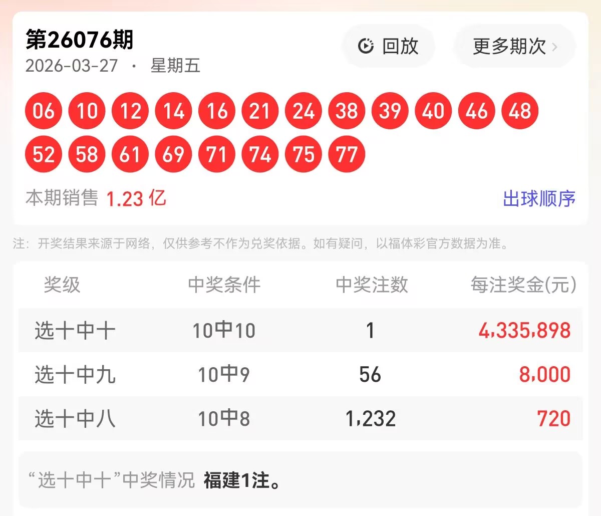 上期福彩快乐8第 2026076期开奖号码为【06 10 12 14 16 21 24 38 39 40 46 48 52 58 61 69 71 74 75 77】,其中大小比10:10,奇偶比为7:13,和值为851,跨度71,四区间比为5:5:4:6。下面是对本期对于每个号码的详细分析。