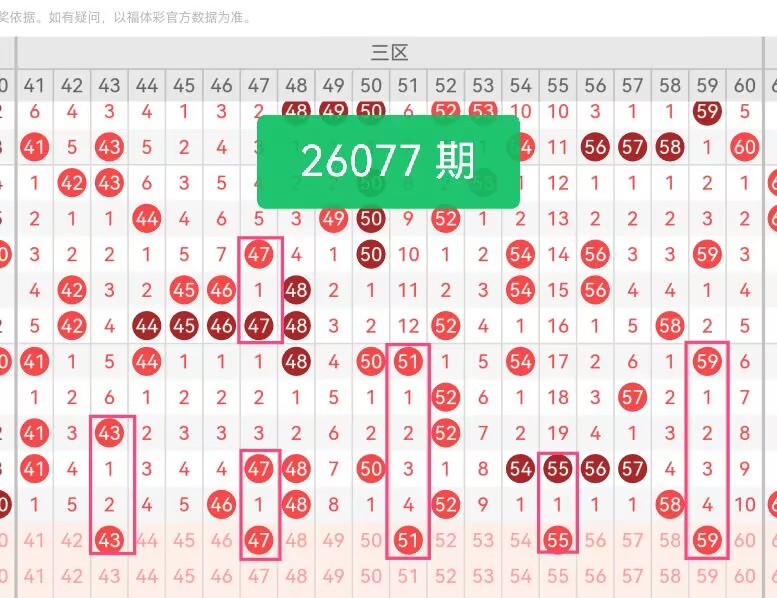 上期第三区间开奖个4号码,本期可能会增加开出。43位于区间前段,近期走势平稳,出号节奏规律,能有效填补前段空白区域。47处于中段核心位置,近期活跃度较高,走势连贯且信号清晰,是区间内重点支撑号码。51为中后段关键点位,近期逐步回补,出号趋势向好,与周边号码搭配协调。55属于区间热门号码,近期出号稳定,整体走势强势,奇偶分布合理。59处于区间后段,近期表现温和,衔接前后号码,完善整体布局。