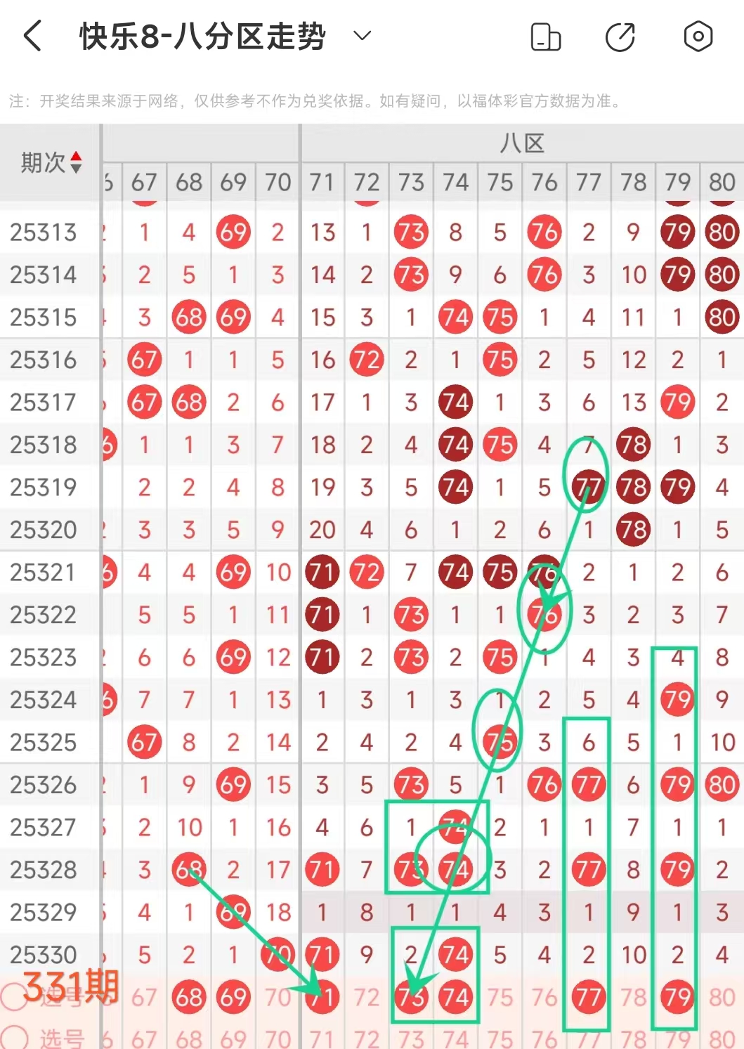 上期八区开出71 74这2个号码, 本期可以考虑2个左右
