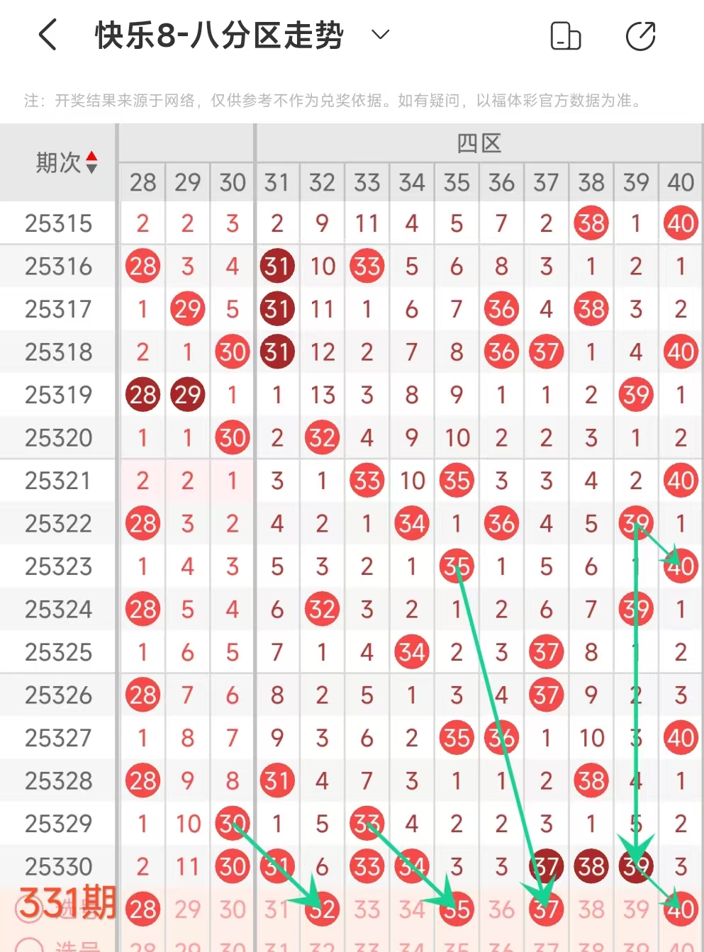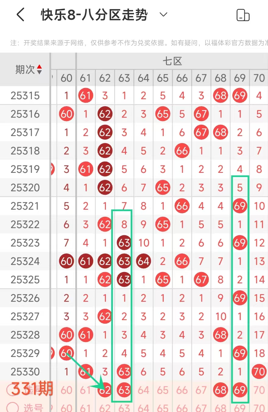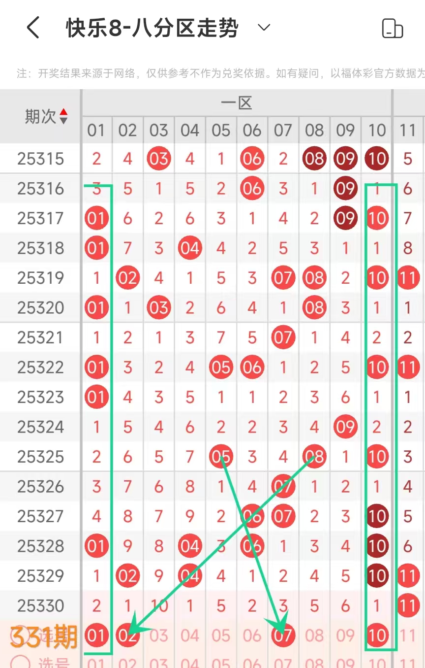 在快乐8的探索之旅中,通过对开奖走势图细致入微的观察,我们总结出一些具有参考价值的规律。几乎每一期开奖号码都呈现出以下显著特征:其一,大概率出现连号;其二,常常伴有边码;其三,遗漏值为1 2 3的号码频繁现身;其四,重号现象也较为常见。掌握这些要点,能为我们的投注提供方向指引。我们约定采用八分区走势图来展开分析。
