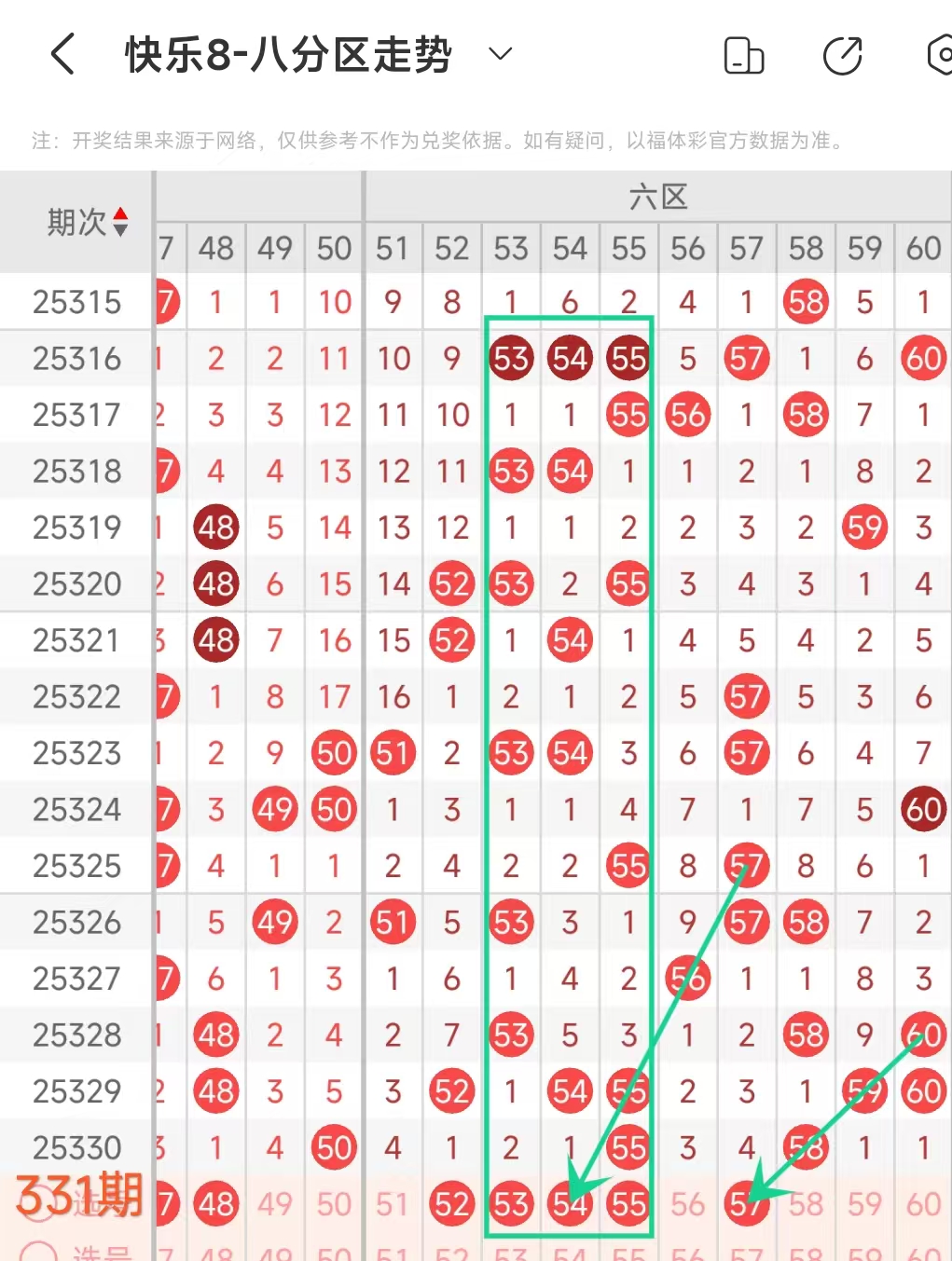 上期六区开出55 58这2个号码,本期应该出3个。