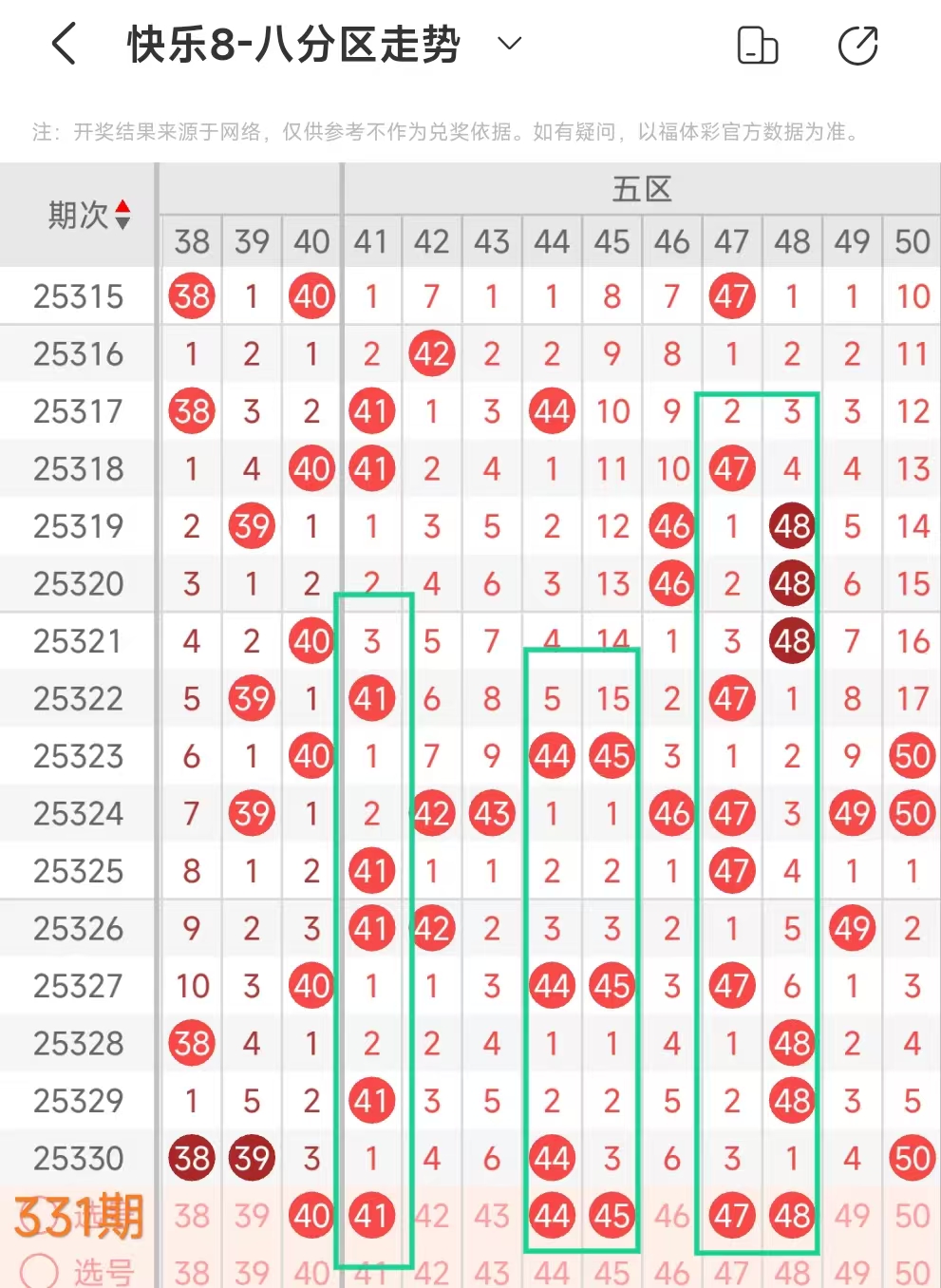 上期五区开44 50这2个号码,本期该区应该出号2个左右