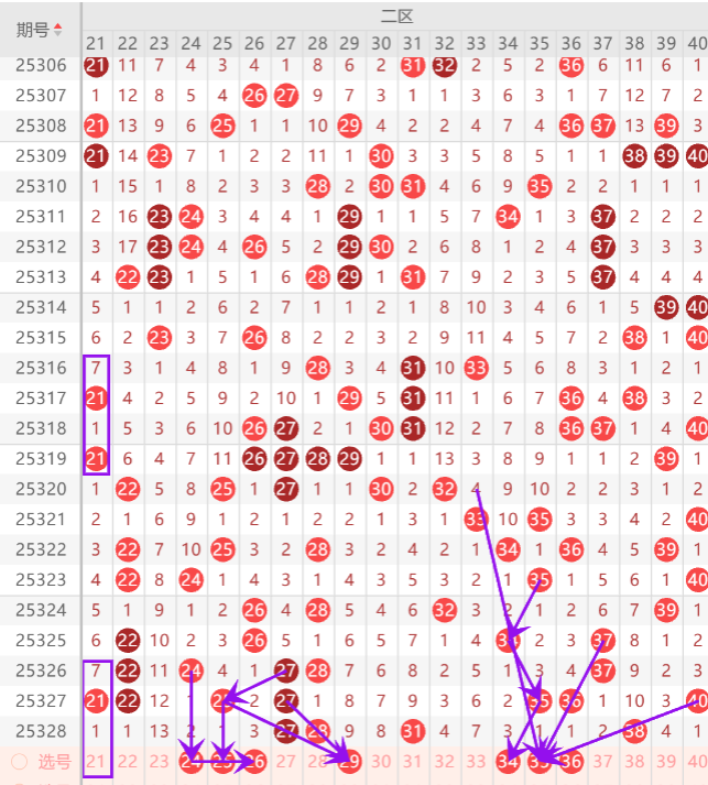 二区间注意参考的号21.24.25.28.30.32.33.35.39.40中关注3-4码开出机会。