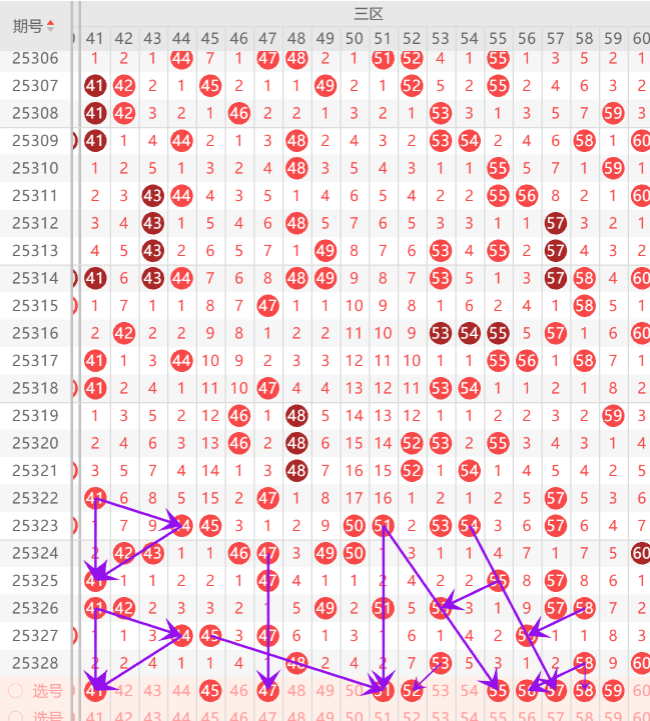 而三区的打底号是41.44.47.48.49.51.52.53.56.58.59.60参考3-4码开出机会,