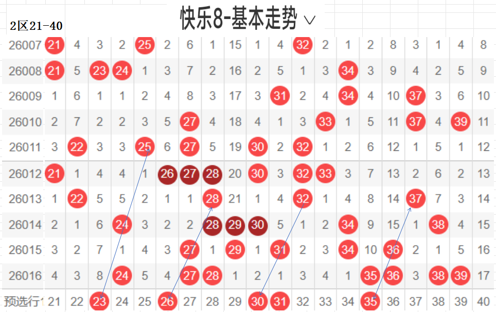 二区(21-40):遗漏5期以下有18个,0码24 27 28 35 36 38 39 7个,数据所示,冷码平均,选择条件增多了.上期开出了7个号码,出码比较分散.这期布防相应增加,重码按比例落这区较少,先给出关联码23,这个区间间接走势,温区,21-30区间上期开了3个,依旧不是重点选号区间,31-40区间开出4个,本期关注热码的回补,间隔小遗漏值最佳,3字头转热,这个小区热码注意回调,可以做关联码的布局,注重温冷码的回补.
