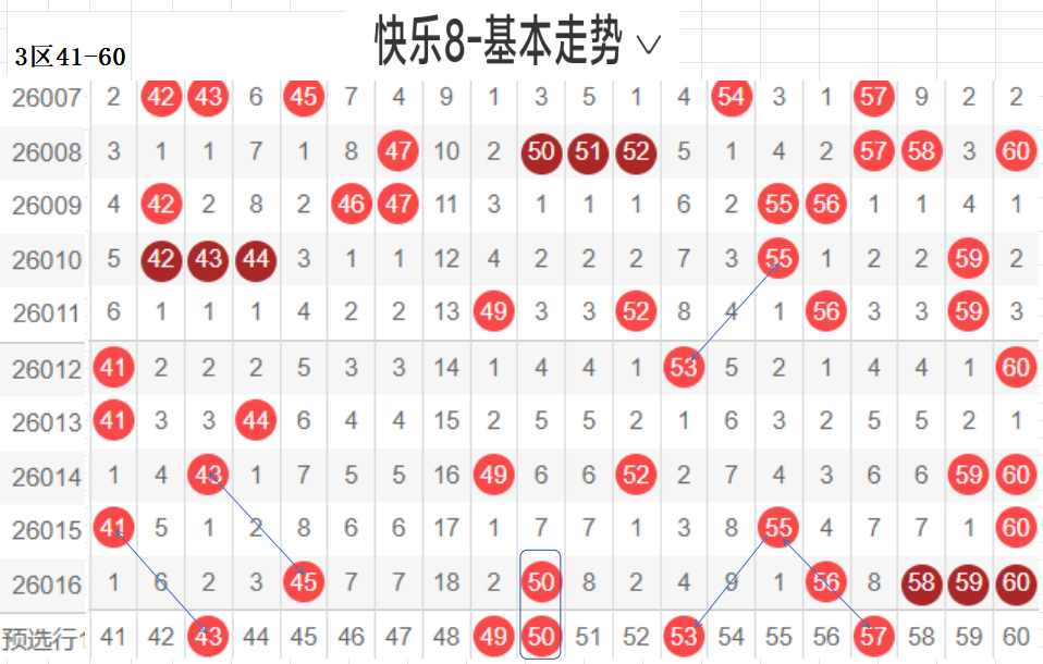 三区(41-60):遗漏5期以下有13码,0码45 50 56 58 59 60 6个,温开方式,这区码数有回暖之意,可以防一手,先定胆码走势较大者,隔期,斜三连,分边号码,可重防,间隔5期以上号码可以随走势选取,例如本期大冷码,走势比较大,可以做胆,通常联动可带出,分边对称的号码,本区间也有很大走势.可关注下.隐形夹角号码.做补位形态号码.都需要观察动态走势.以上是本区间的选码方法.