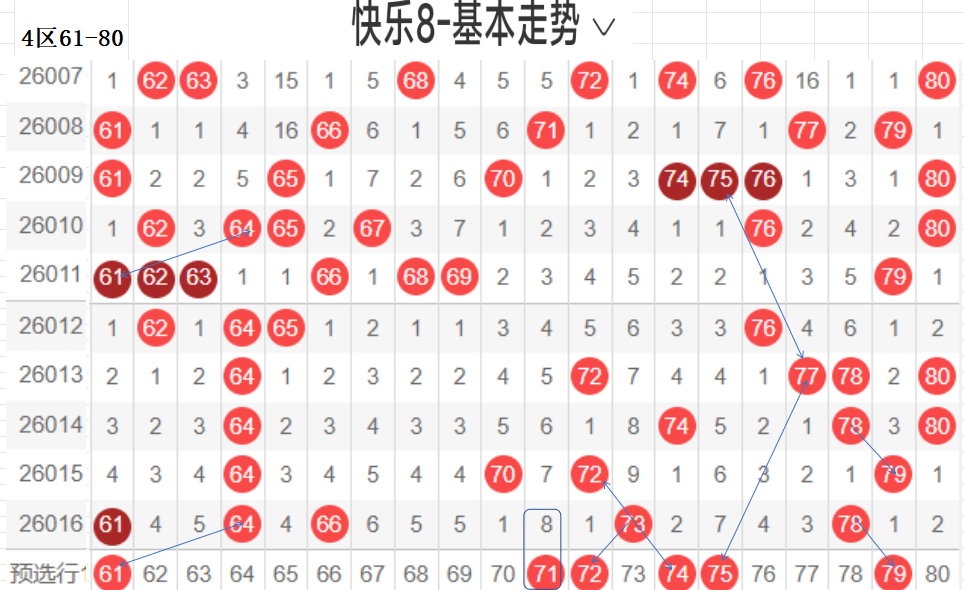 四区:(61-80):遗漏5期(含5)以下有18码,0码61 64 66 73 78 5个,平均温开方式,上期开出5码,区间回暖,后区可防,四区间从以往数据来看,重码很强,一枝独秀的存在,近期有回补走热的趋势,区间回暖后,本区间后区可防,与一区相比,也是温区.,对称下落码,隔期回补码,可以防守,这区对呈对称三角关系的胆码,斜三连有走势的胆码,联动落位码,都有各自的走向落位关系,根据走势选择一种方式选码.