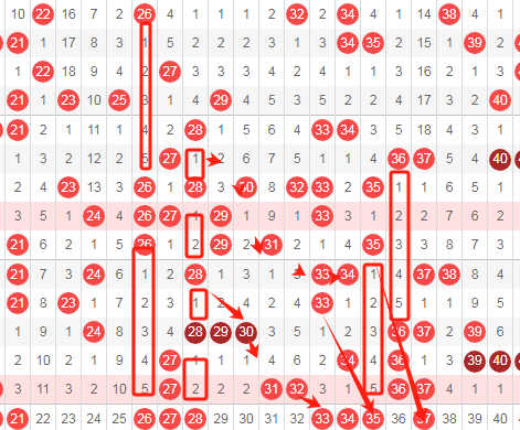 今日三区号码建议参考21的遗漏对等形态,三区后区建议参考26的遗漏对等形态,防26 27 28三连,今日四区号码建议参考34的菱形形态,防33 34同落或者34 35同落,四区后区建议参考37斜连重号,今日三区四区推荐号码21 26 27 28 33 34 35 37