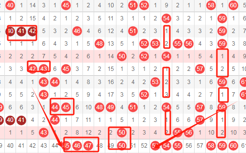 五区前区号码建议参考45 46 47平行梯形递减落号,五区后区建议参考50孤号走重,六区建议参考55的重号,防54 55对子下落,六区后区参考59的遗漏对等形态,防58 59或者59 60对子号开出。五区六区推荐号码45 46 47 50 53 54 55 58 59 60
