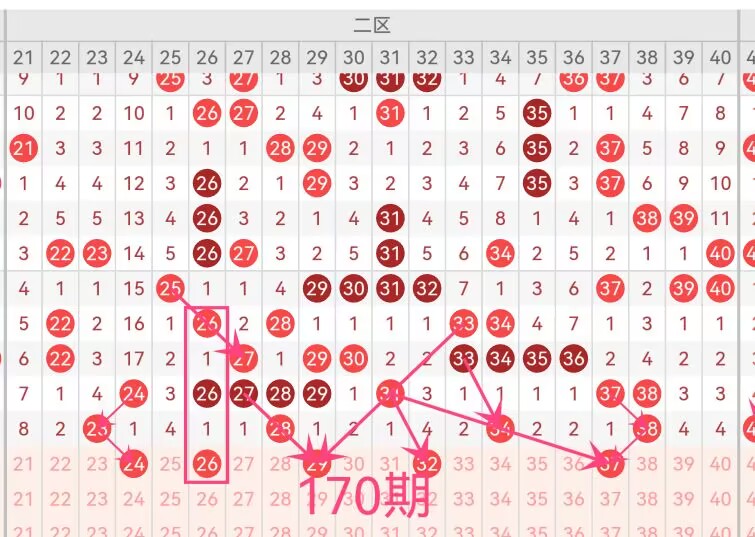 21-40区间,上期仅开出4个号码(23 28 34 38),此区间出号较少,本期此区间可能会增大开出。这个区间最大的特点就是容易出现等距出号的情况,比如前期开出的28和38很可能带动号码29和37在本期出现。近期遗漏值适中的稳码值得关注,如号码32已经遗漏4期,这个号码符合“遗漏回补”规律,具有较高的会概率。冷号24在最近18期出现1次,属于本区间较为冷的号码之一,本期考虑号码24会回补出现的情况。热号26在最近15期出现7次,属于本区间最热的号码之一,本期考虑号码26会继续出现的情况。因此综合推荐该区间号码【24 26 29 32 37】