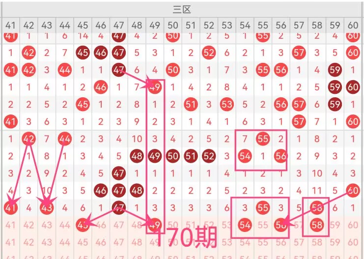 41-60区间,在上期开出了5个号码(41 43 47 55 58),此区间出号较平稳。按照走势规律,稀疏出号后往往会出现一定程度的回落,预计本期会增加到2-3个左右。这个区间的号码特征比较明显,经常会出现斜连号或等距出号的情况。比如号码47出现可能会带动号码45和号码49的出现。号码58遗漏多期后,常常会回补出现,形成宠爱后形式。号码54和56作为本区间较冷的号码,存在一定的回补率,看好此号码的出现。因此综合推荐该区间号码【43 49 54 56 58】