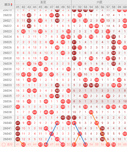六区开出:56 奇偶比: 0:1 和值:56 跨度:0,上期开出1个号码,偶数。上期仅出一码,出号量明显低于近10期均值,这与之前一期出现的低出号形成呼应。历史数据显示,六区在低出号后往往迎来热号群的集中复苏,尤其是53、55、57、58这类往期热号,已显现热度回升的迹象。目前51遗漏3期,具备强劲的复苏动力,而冷号53、58均遗漏6期,进入强回补区间。57作为邻号同样值得关注。