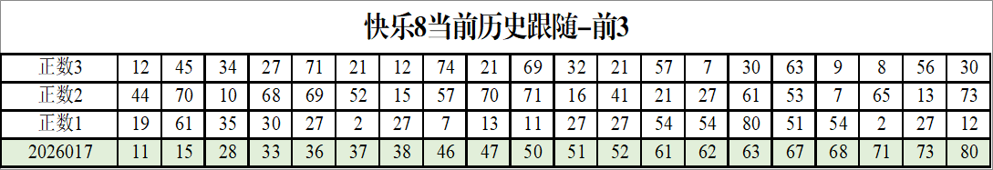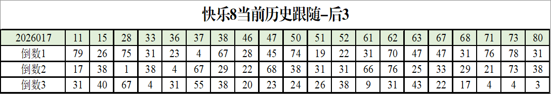 我感觉选热的同时,还要注意防冷条件开出,可以直接选取每个号码跟随出次前三的号码,也可以考虑把出次最后的三个数字加进去,不过这样可能号码太多,可以尝试。图上也能看出单独号码跟随的情况,我就不一一统计每个号码的出次了,我这里考虑提高概率,取每个号码历史跟随的前三号码和后三号码,根据2026017期的号码,我关注正数3和倒数3的号码号码为: