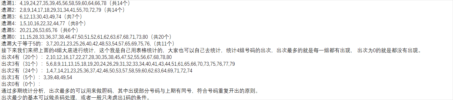 如果把对数和补数合起来有40个号码,中间可能还会产生一下重复数,通过近几期的统计分析,以上期数据进行补数对数计算推算下一期的概率不高。为提高概率,我主要是用前两期的数据来进行对数补数推算,然后再组成一个集合,作为我的第四组大底号码。