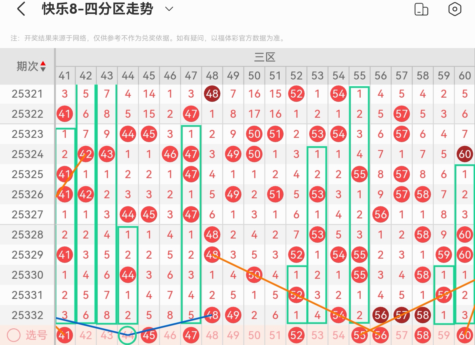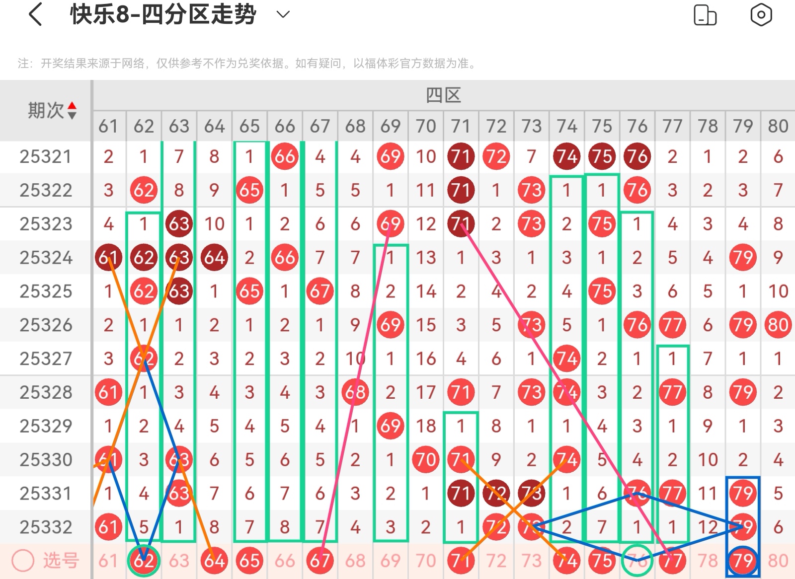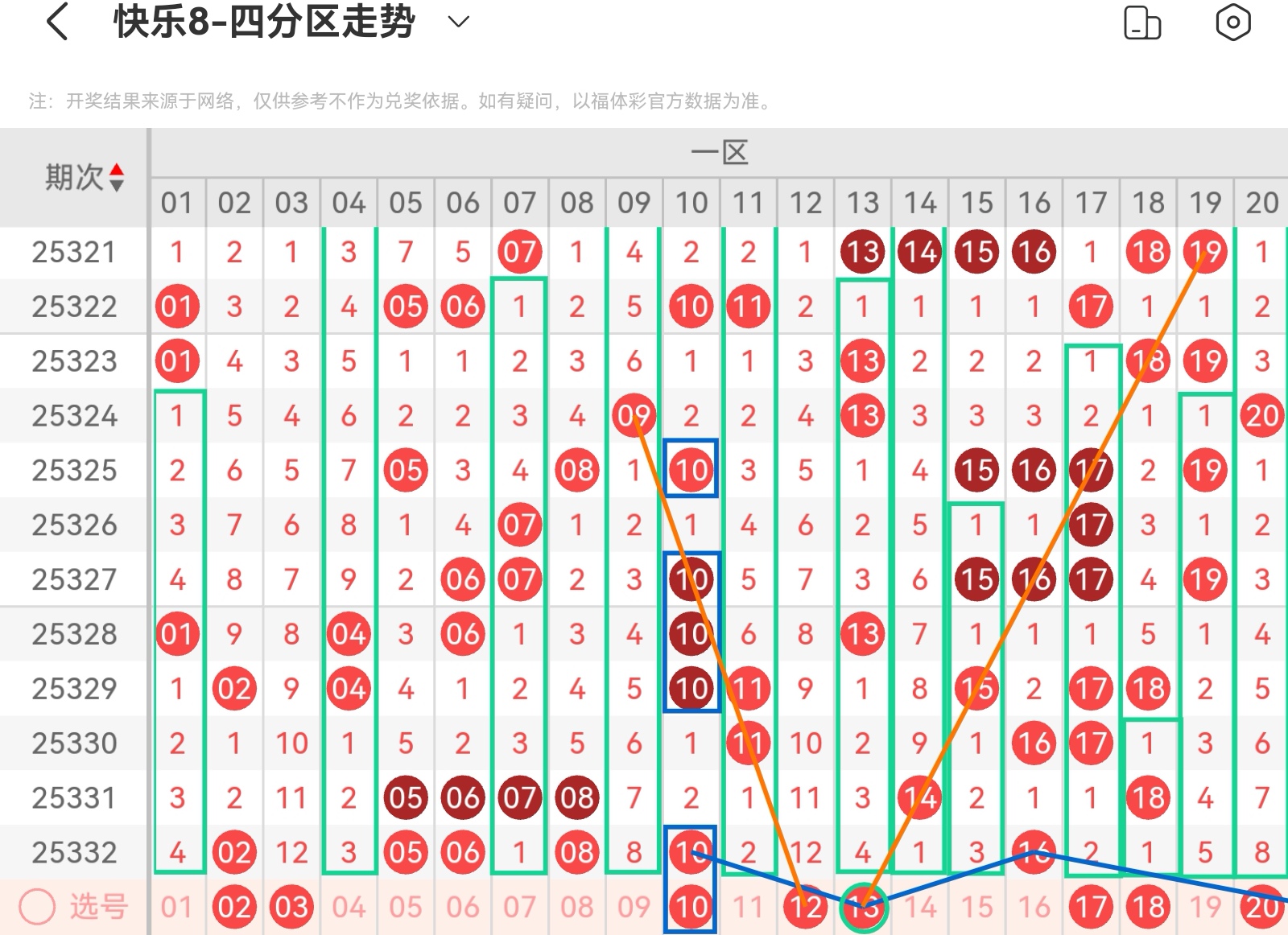 大家好,我是甜丝丝的坏事,主要以快乐八的形态走势、空位走势、遗漏走势以及斜连走势相结合的方法,用公认的四分区走势来进行预测分析,希望能让你有所收获。