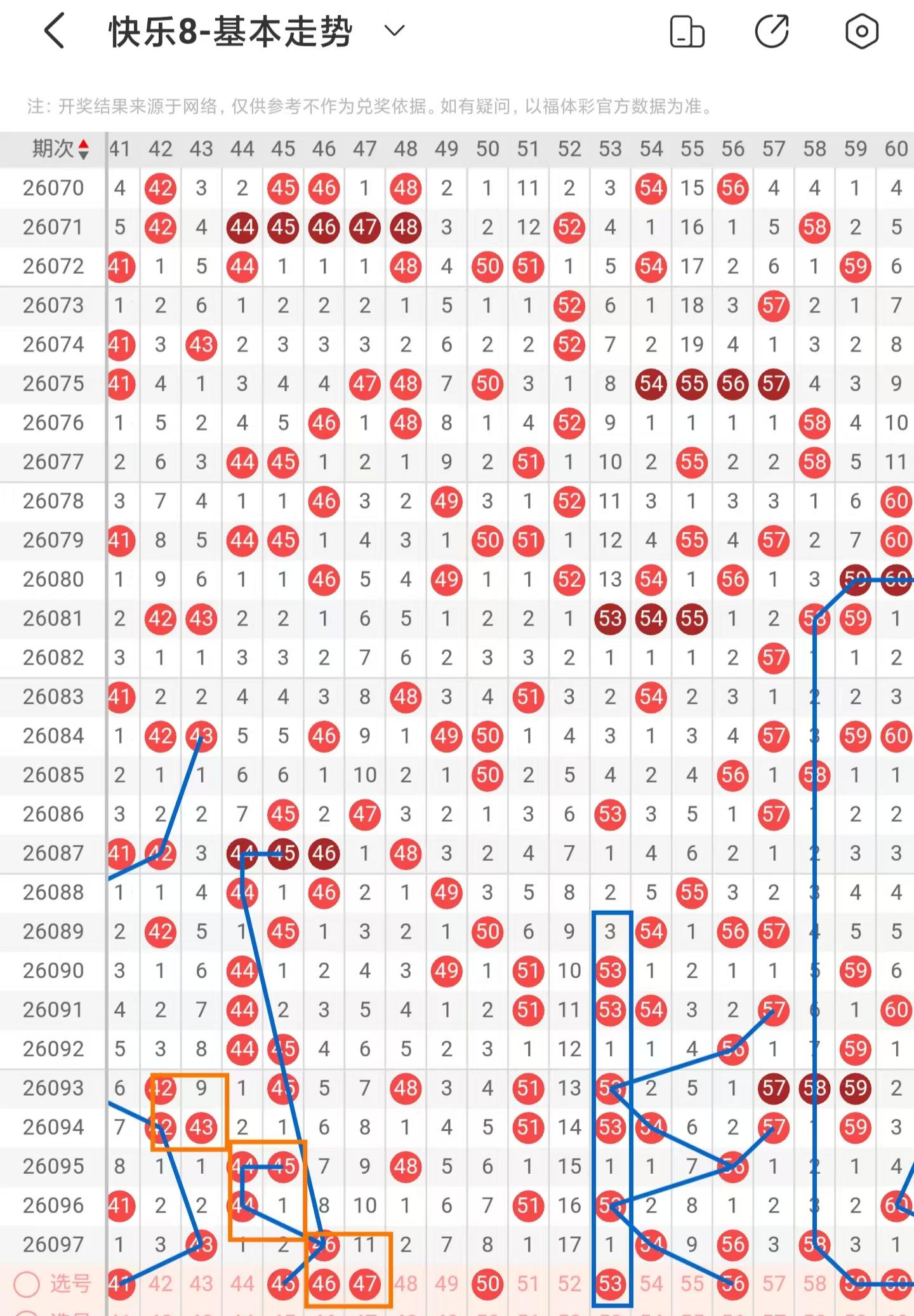 三区间上期稳定落号,一共开出五个号码球,本期考虑等同数量的号码球,以40号码球为对称走势起点,注意走势形态的41号码球,注意期数和值加减法的45号码球,同时也是百期相似形态号码球,两码同落下期回补一码的走势注意46、47号码球,防守50号码球,注意期数和值加减法的53号码球,注意近期54、56号码球同落,下期回补54号码球,近期53、54、56、57号码球走势相似,本期注意56号码球,以58号码球为对称走势起点,注意走势形态的59、60号码球,注意54、56、58号码球的重落回补,因此三区间关注45-46-47-56-60,注意本区间的选二复式45-56-60。