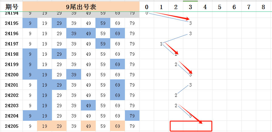 选择九尾的原因,很简单。截至目前,九尾是所有尾号中最热的号码,已开出六次的多码走势(五码及五码以上)。对最热的尾号,应该有应有的尊重。