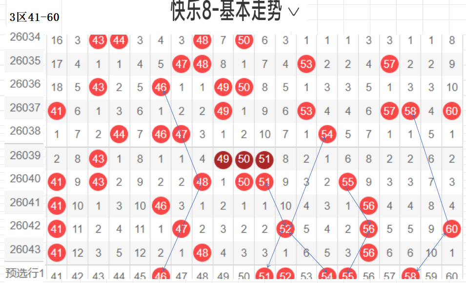 三区(41-60):遗漏5期以下有14,041 48 56  3,温开方式,这区码数有回暖之意,可以防一手,先定胆码走势较大者,隔期,斜三连,分边号码,可重防,间隔5以上号码可以随走势选取,例如本期大冷码,走势比较大,可以做胆,通常联动可带出,分边对称的号码,本区间也有很大走势.可关注下.隐形夹角号码.做补位形态号码.都需要观察动态走势.以上是本区间的选码方法.