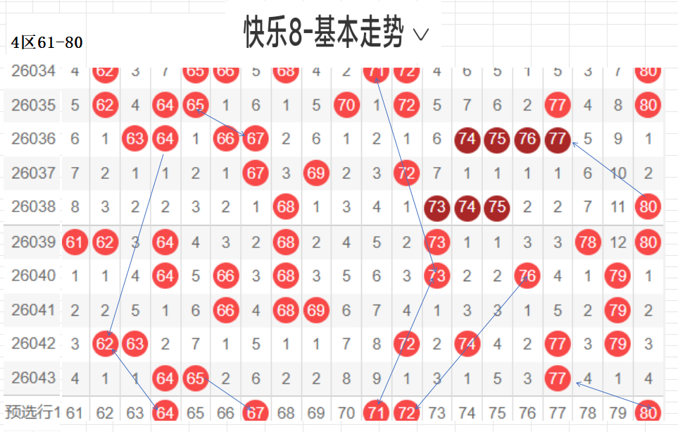 四区:(61-80):遗漏5(5)以下有17,064 65 77  3,平均温开方式,上期开出3,区间回暖,后区可防,区间从以往数据来看,重码很强,一枝独秀的存在,近期有回补走热的趋势,区间回暖,本区间后区可防,与一区相比,也是温区.,对称下落,隔期回补码,可以防,这区对呈对称三角关系的胆码,斜三连有走势的胆码,联动落位码,都有各自的走向落位关系,根据走势选择一种方式选码.