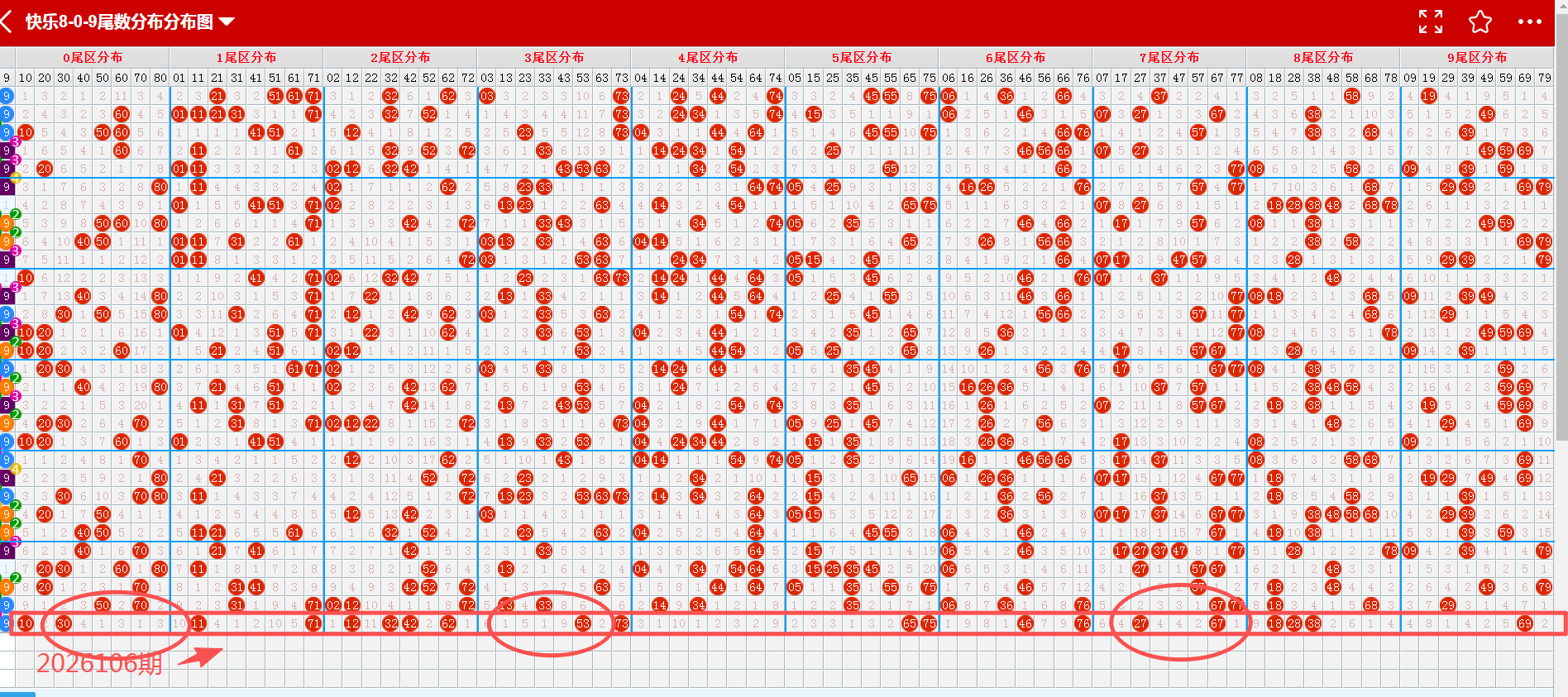 上图是快乐八2026106期的尾码走势图,从图中看0尾到9尾出号个数依次是:0尾号码区开出2个;1尾号码区开出2个;2尾号码区开出4个;3尾号码区开出2个;4尾号码区开出0个;5尾号码区开出2个;6尾号码区开出2个;7尾号码区开出2个;8尾号码区开出3个;9尾号码区开出1个;再看小尾号码(0尾-4尾)区有10码,大尾号码(5尾-9尾)有10码;数据比对统计后可以看到本期2尾出号数量最多,一共开出了4个中奖号码。本期4尾区出现断区!由走势比对推断2026107期重点需要关注0、3、7尾区号码下号热度回补和落号数量增加的概率较大。