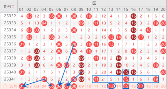 该区间的01号数字是有机会出号的,毕竟上期开出了04号数字是有机会把01号数字带出来的。本期的05 06 07号数字我们注意出一个号码的情况,其中的06 07号数字可以重点关注一下。上期开出了08 09 11号数字,本期我们注意一下出一个重号的情况期,其中的08 11号数字我们可以重点关注一下。本期的13 17号数字是属于空三中心号码,本期是有机会出一个号码的,我们可以重点关注一下。本期的15号数字我们注意一下出三重的情况。