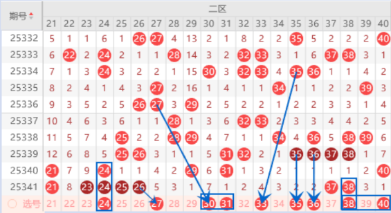 该区间上期开出了21 23 24 25 26号数字,本期我们注意一下出重号的情况,其中的21 24 25号数字我们可以重点关注一下出重号的情况。本期的27号数字是属于连带关系号码,出号机会也是有的,我们可以关注一下出号情况。本期的30号数字是属于夹号回补号码,本期是有机会出号码,本期可以防守一下30 31号数字同出的情况。上期开出了37 38号数字,本期我们注意一下出一个重号的情况,其中的38号数字可以重点关注一下,本期可以防守一下38 40号数字同出的情况。