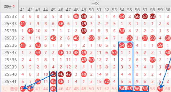 该区间的41 42号数字我们注意一下出一个号码的情况,本期可以防守一下41 54号数字或者42 45号数字同出的情况。上期开出了45 46号数字的重号,本期我们注意一下出一个三重号码的情况,其中的45号数字可以重点关注一下。本期的54 55号数字是属于连号落号情况,本期是有机会出一个号码的,我们可以重点关注一下。本期的56 57号数字也是有机会出一个号码的,我们可以重点关注一下。本期的59号数字是属于三斜连号码,出号机会也是有的,可以关注一下。