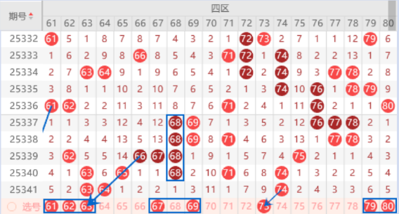 该区间的61 62号数字我们注意出一个号码的情况,其中的61号数字可以重点关注一下出号情况。本期的63号数字我们注意一下出三重的情况。本期的67 68 69号数字是属于重号68号数字的边号回补号码,本期是有机会出一个号码的,其中的67 69号数字我们可以重点关注一下出一个号码的情况。本期的73 76 79 80是属于0路号码,断号4期了,本期是有机会出一个号码的,其中的73 79号数字我们可以重点关注一下出号情况。