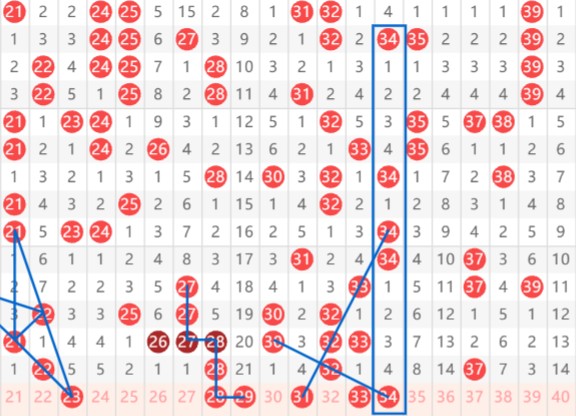 【第二区间21-40】:上期开出4个号码。本期推荐号码:23-28-29-31-33-34,23斜连形态和断尾回补,同时与区间同尾形态考虑,28-29主要以大“L”形态考虑,辅之一假四连带出31形态开出概率,33遗漏一三期带34对子回补。二区间推荐重点号码:23-31-33。