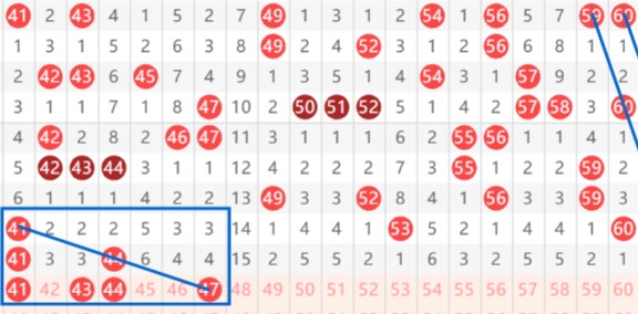 【第三区间41-60】:这个区间上期开出2个号码。本期推荐号码:41-43-44-47,本区间主要考虑以1、4、7同路带出号码为主。还需要注意一点47与一区间07为伙伴出号常见形态。三区间推荐重点号码:41-44-47。