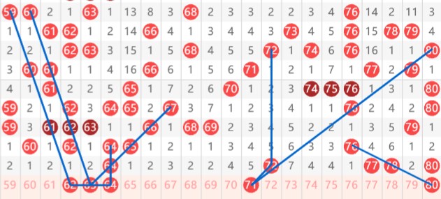 【第四区间61-80】:这个区间上期开出5个号码。本期推荐号码:62-63-64-71-80,62-63-64为四区间大“L”形态和斜连、等距对子等形态考虑,71-80龙头凤尾来考虑。四区间推荐重点号码:63-71-80。