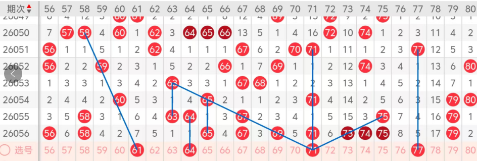 第四区间的走势分析:第四区间上期开出了八个号码球,主要的落号点位在四区间的前后半区,走出了七奇一偶的形态走势,上期四区间的前半区落下了三个号码球,后半区落下了五个号码球,整个四区间处于走热的趋势,根据四区间的走势规律,今天的四区间我们主看斜连码以及对称形态的走势,主看前半区的61 64,同落下的机会很大,再看后半区的71 77这两个号码球的落位,走出了61 71组合以及64 71 77的组合,这四个号球建议大家打个四胆拖,或者打个四码复三比较稳妥,参考为主!