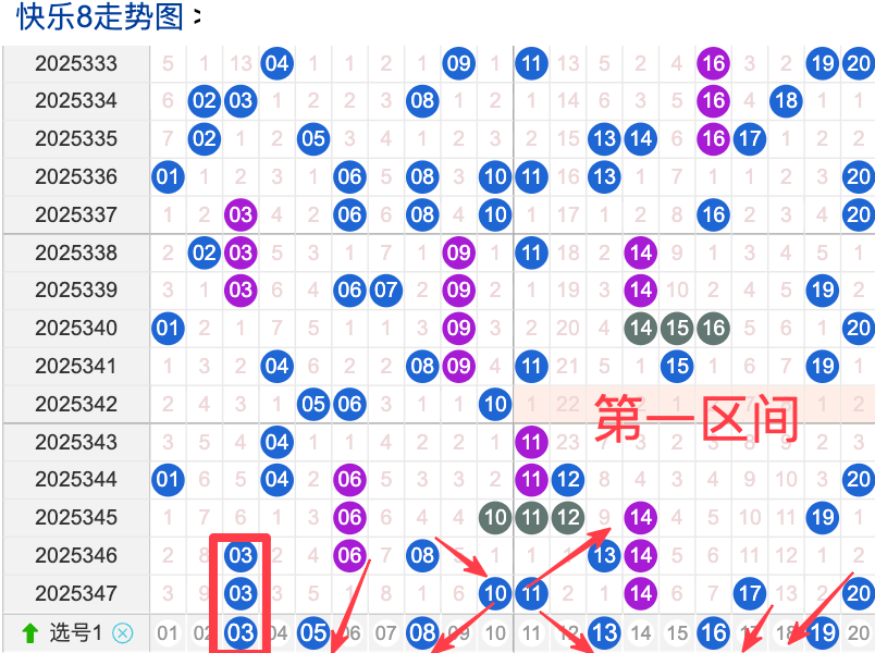 上期一区开6奖号(03.10.11.14.17.20)上期回顾一区开6个奖号一区间的奖号在上期呈现了递增的趋势,本期先来看号码05具有一定的间歇性,近期比如有时会间隔 3 到5期次出现,整体出现频率较热,号码08活跃度近期较热。有一定的间歇性,间隔上来说的话还是很稳定的,整体走势有一定的波动性,没有明显的冷热趋势变化,出现的频次近期比较热.号码16活跃度相对较热,没有明显的连续出现态势,偶尔间隔多期会出现一次整体表现较热近期出现的频次比较热。