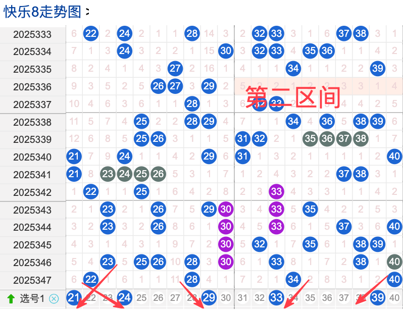 上期二区开出4个奖号(22.28.34.40)上期回顾二区开出4个奖号二区间在上期落位同比前期的话呈现了一个递减的落位趋势,先来看本期号码21整体活跃度较温冷,在近 30 期里有一定的间歇性出现,不是每期都开,近期整体走势不是很稳定。号码24近期热度较热,间隔性比较好,说明其在当前阶段活跃度较热注意防守。号码33近期活跃度较热,有一定的间歇性近期整体走势相对平稳没有特别明显的冷热趋势变化,号码39近30期内活跃度较热,没有明显的连续出现形态走势,整体表现比较动荡还是很稳定。