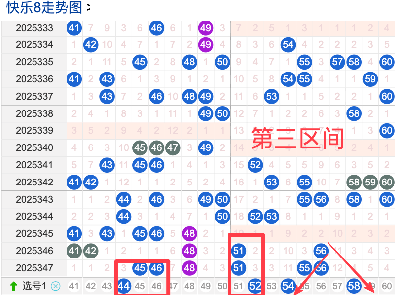 三区间开出了6个奖号(45.46.48.51.55.56)上期回顾三区开出6个奖号上期的三区间的奖号数量呈现一个递增的形态,4头回补3个,本期先来看号码44近期出现频率相对来说还不是很稳定。偶尔有时间隔期数也是很长,说明其在近期的开奖中较温冷的,号码52在近 30 期内出现次数相对还是稳定的号码,近期的活跃度也是较热。号码54有一定的间歇性,通常间隔5-4期会出现一次,没有明显的连续出现态势,走势相对较一般,在整个第三区间的表现本期还是可以防守的。号码58走势相对近期较热,近期没有连续间隔落号的情况,活跃度近期处于较热状态注意防守。
