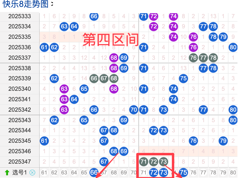 上期四区间开出了4奖号(67.71.72.73)上期的四区开4个奖号呈现了一个递增的趋势,开出的奖号7头回补3个,6头回补1个,先来看号码66在近 30 期内属于还是很稳定的号码,近期出现频率相对也是稳定的,偶尔会间隔多期后出现一次,这个号码要注意防守,号码72具有一定的间歇性活跃度较热比如有时会间隔 3到5期就再次出现,也有时会间隔多期,近期整体出现频率比较热,近期还是要关注的.号码75活跃度近期比较冷,有一定的间歇性。活跃度近期较冷,整体走势有一定的波动性.