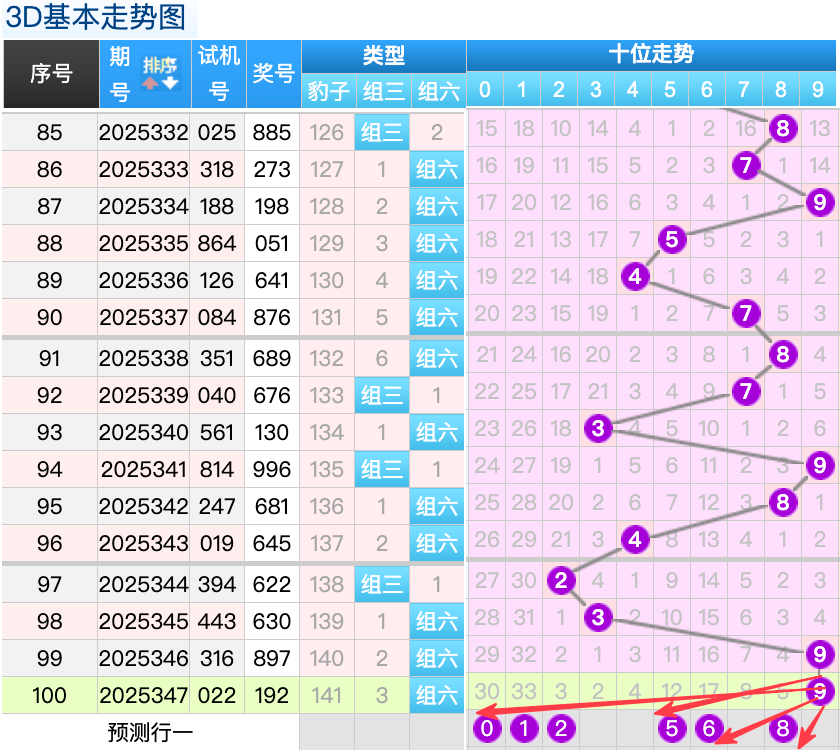 上期3D十位开出的奖号是9号,上期在十位上9号球这个号码在上期是一个小周期重码回补的落位点,本期来看5号和6号球在十位上要注意这两个号码是有机会继续顺着上期的9号球继续走出两个常搭配落位趋势这里的两码都是冷号注意防守一码就好了,然后2号球还是一个冷回补的落位形态也是一个错位的落位形态,1号球还是一个号码这里是一个冷码落位点,再来看8号球是顺位的回补这个点位参考就好,9号球这里的号码要防守走出重码回补的落位趋势。