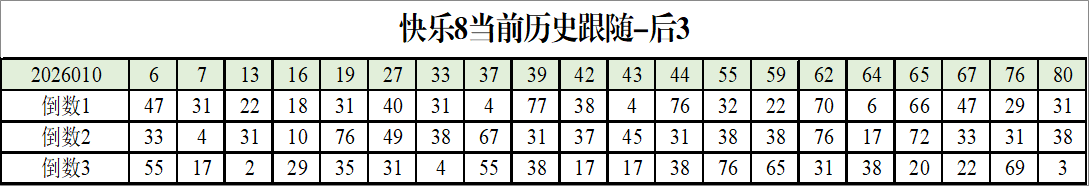 我感觉选热的同时,还要注意防冷条件开出,可以直接选取每个号码跟随出次前三的号码,也可以考虑把出次最后的三个数字加进去,不过这样可能号码太多,可以尝试。图上也能看出单独号码跟随的情况,我就不一一统计每个号码的出次了,我这里考虑提高概率,取每个号码历史跟随的前三号码和后三号码,根据2026010期的号码,我关注正数3和倒数3的号码号码为: