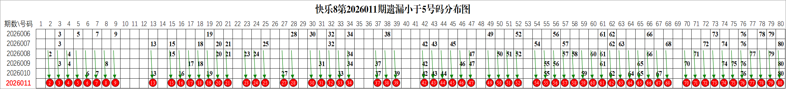 所以这个条件值得关注,从号码分布图上我们可以分析出,遗漏小于5期的号码有: