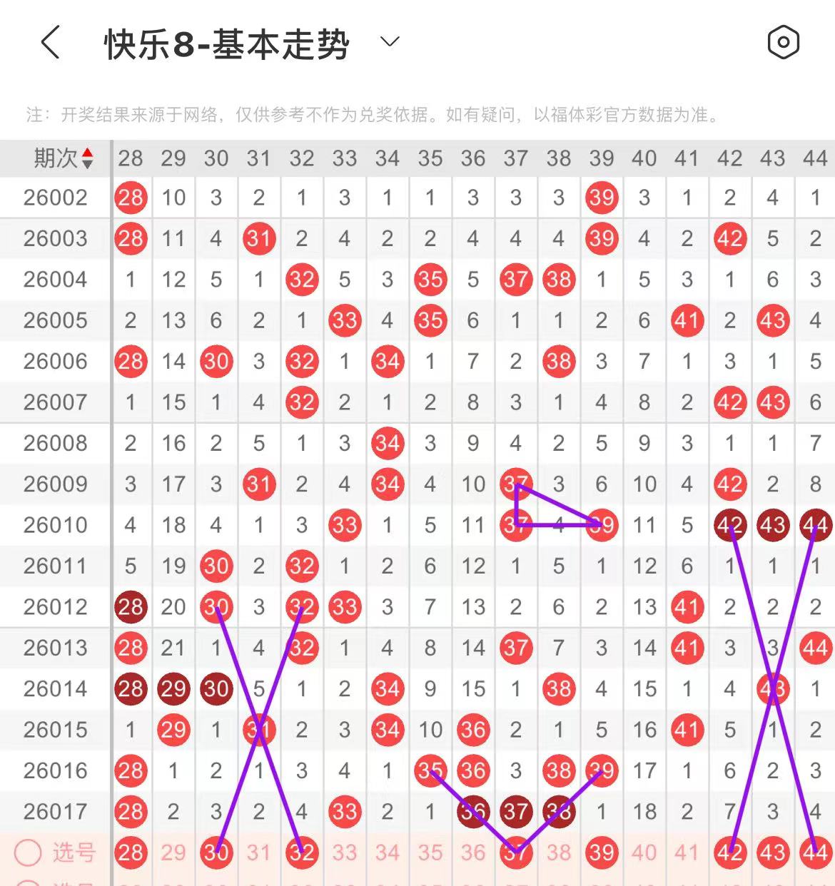 31-40区:本区间上期开出了四个号码,从号码走势图上看,该区现属于热号区,出号个数应该还能保持在两三个号码左右,有出号走势的号码有32号,斜连出号走势,37号,双线斜连出号走势,防37.39同出。