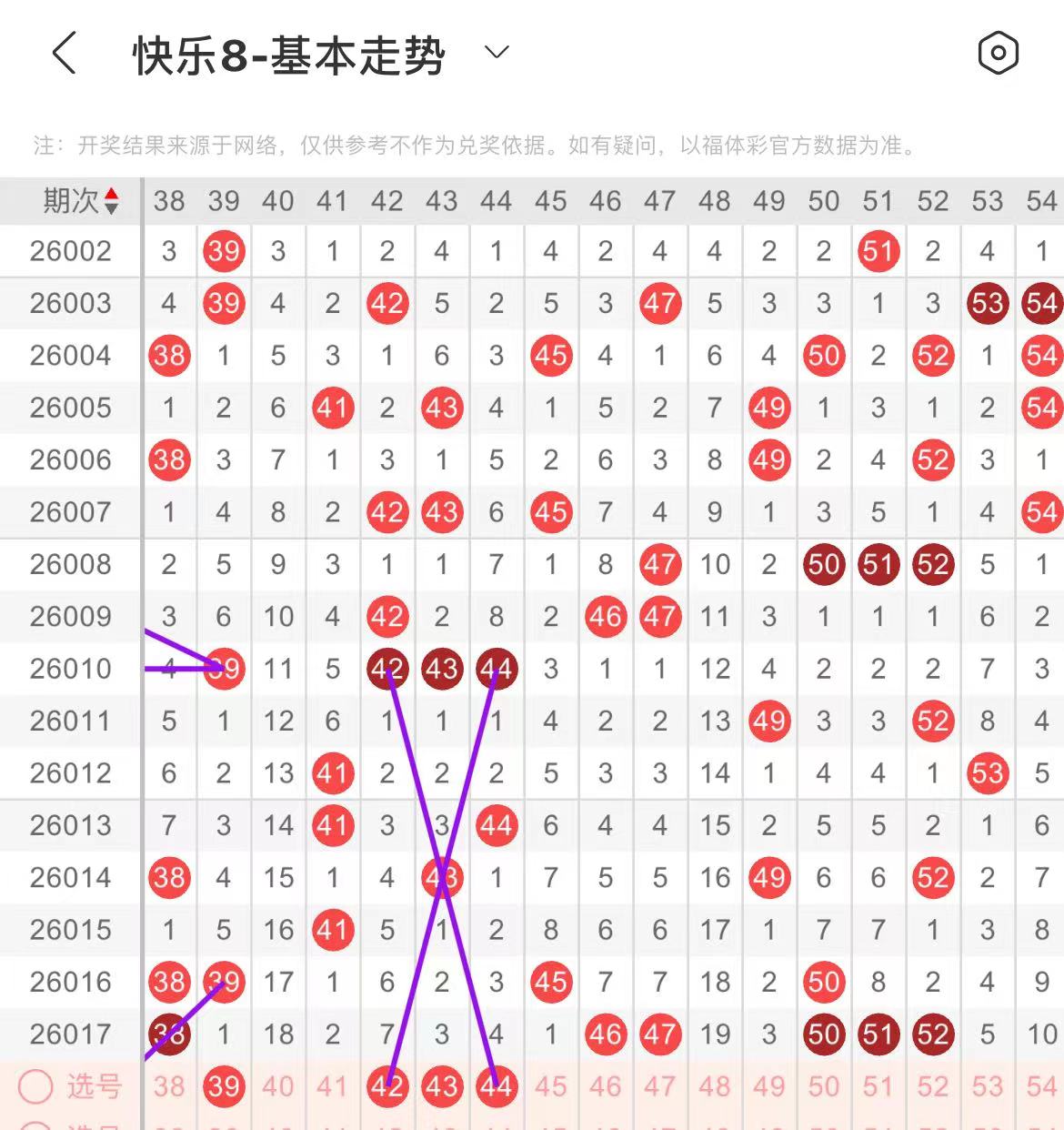 41-50区:本区间上期开出了三个号码,从号码走势图上看,该区号码走势有回暖的趋势,重点关注前半区号码回补,出号个数在三个号码左右,有出号走势的号码有42.43.44号,开出三连的可能。