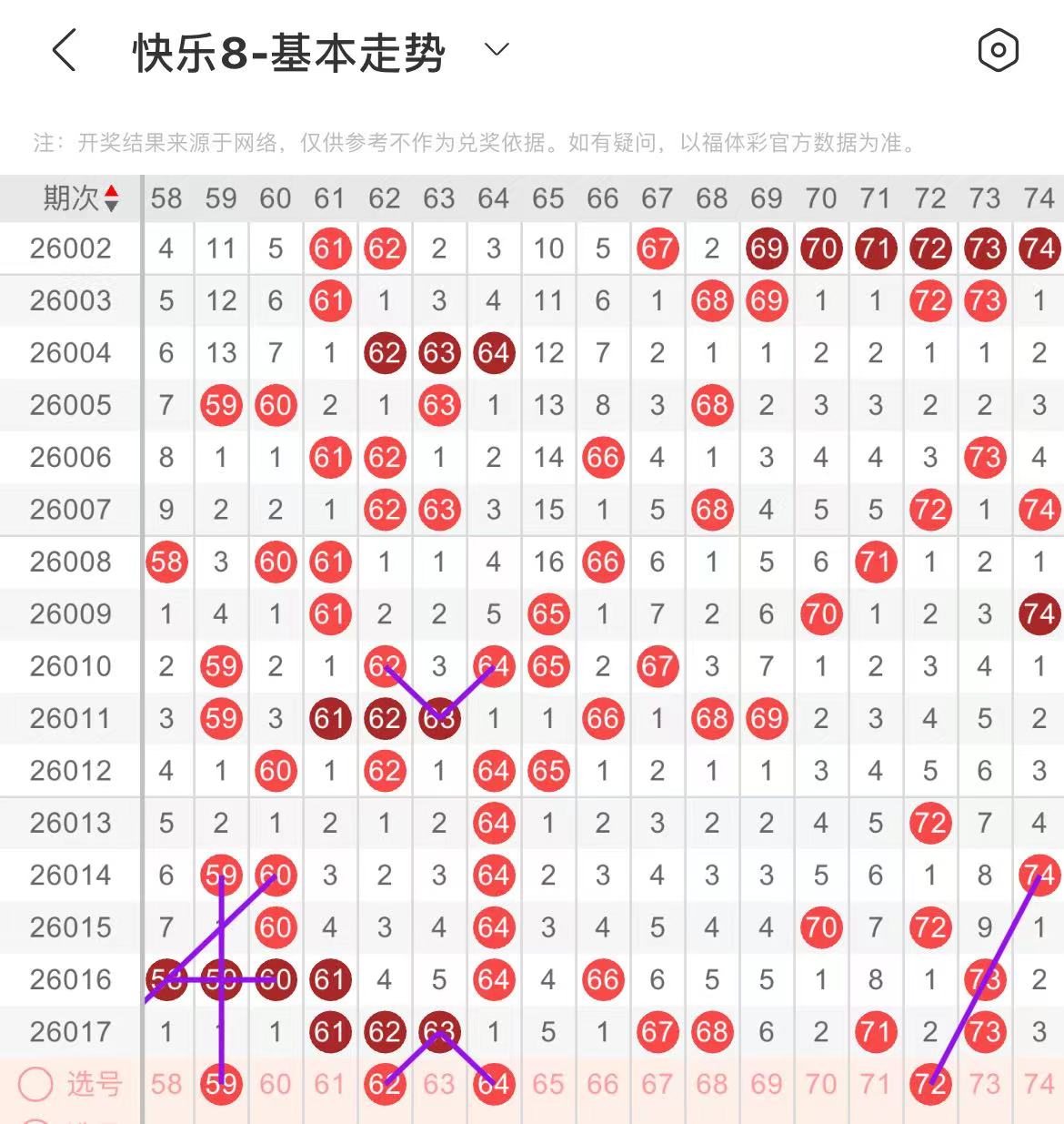 51-60区:本区间上期开出了两个号码,从号码走势图上看,该区现属于温号区,出号走势个数在两个号码左右,重点关注后半区号码回补。有出号走势的号码有56号,斜连出号走势,59号,隔期相同出号走势。