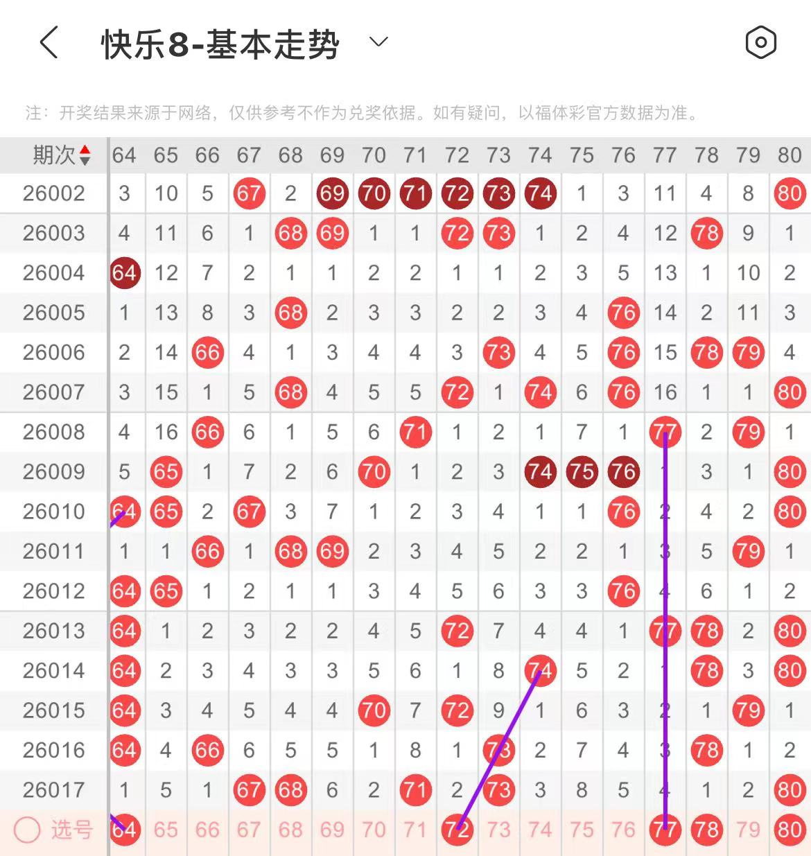 71-80区:本区间上期开出了三个号码,从号码走势图上看,该区号码走势有走热的趋势,本期继续看好该区出号个数走高位,出号个数在三四个号码左右,有出号走势的的号码有72号,斜连出号走势,77号,隔期相同出号走势,防77.78或者77.79同出,80号,三次双重号出号走势。