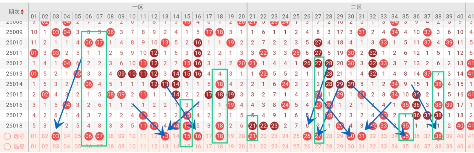 二区上期开出21-22-23-29-32-33-35-40,共8个号码,本期大家可以根据尾数、隔期码、以及边码走势情况,本期首先需看28相邻码、30会再出现;上期29-41区间开出密集号,本期21出号机会比较大,本期二区有连续号21-22预测会出,上期龙头21,凤尾40,本期预测龙头26、凤尾38,本二区间建议大家关注号码30会出,再根据号码走势预防连续号21-22预测会出。综合分析筛选,本期二区推荐:21-24-26-27-30-31-35