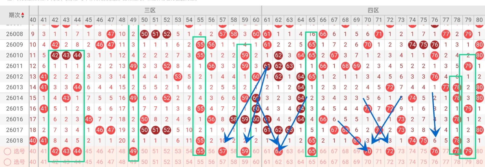 第2026019期福彩快乐8通过以下走势图及一二区间预测分析如下: