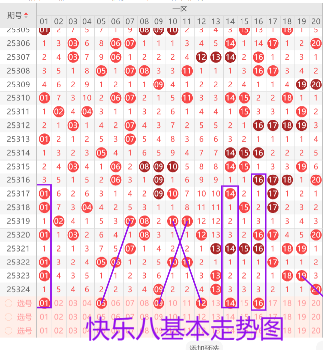 我们来看下一区的基本走势情况,上期开出了三枚开奖号码,本期预测开出3-4枚开奖号码,首先我们来看01的上下重号空一对称走势。05的三斜连形态,09 12的交叉走势建议二选一,或者考虑10 11二连遗漏二出一个。14的空三下号对称,16的空三下号对称。
