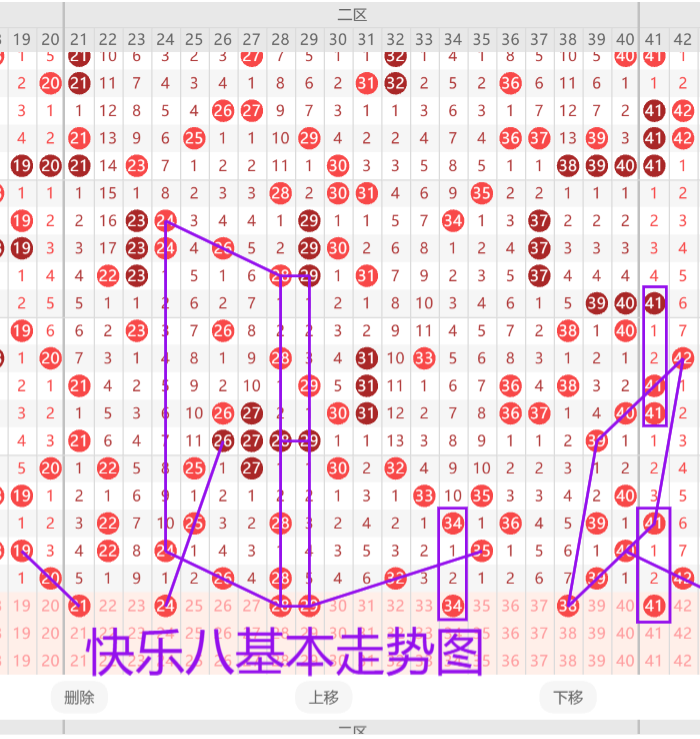 我们来看下二区的基本走势情况,上期开出了四枚开奖号码,本期预测开出4-5枚开奖号码,首先我们来看21的三斜连对称走势,24的三斜连。28 29 (如图所示)对称形态二连走势优先考虑双码或者不做。34的10期遗漏回补空二下号形态。38的四斜连对称,31的空二下号,优先考虑38 41组合。
