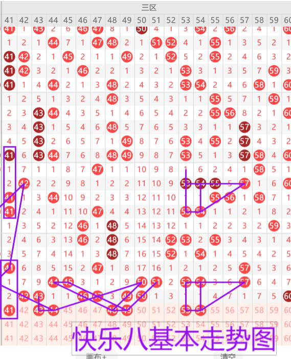 我们来看下三区的基本走势情况,上期开出了七枚开奖号码,本期预测开出5-6枚开奖号码,首先我们来看41的空二下号,44的偶数三斜连,43 44的二连补位形态。48 49的双边楼梯形态。43 44,48 49 建议只考虑一个位置的二连。 53 54(如图所示)形态空一下二连。